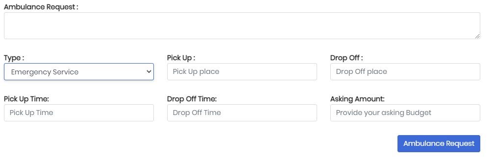 Write Ambulance request note, Select Ambulance Type, Pick up Place, Drop up place, Pick up time, Drop up time, Asking Amount and finally Ambulance Request