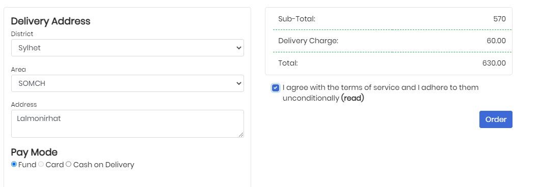 Select Delivery Address, Click terms and condition finally Press the Order option